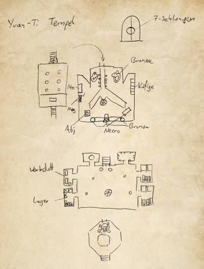 Ein versteckter Yuan-ti Tempel nordöstlich von Wheloon. Der Eingang befindet sich hinter einer Illusionswand in einer Höhle. Nur die untoten Geister der Yuan-ti halten dort noch Wache. Hier der grobe Aufbau des Tempels: